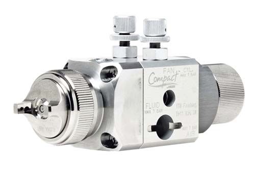The Compact Automatic I Air Spray Gun is composed of hard, anodized aluminum with a needle, spray head and tip of 303 gr. stainless steel. It features a gun weight of 2.0 lbs. or 950 grams, a fluid adjusting knob that efficiently controls spray production and fluid flow in the atomizing and triggering air which is essential for automatic spray machine implementations.