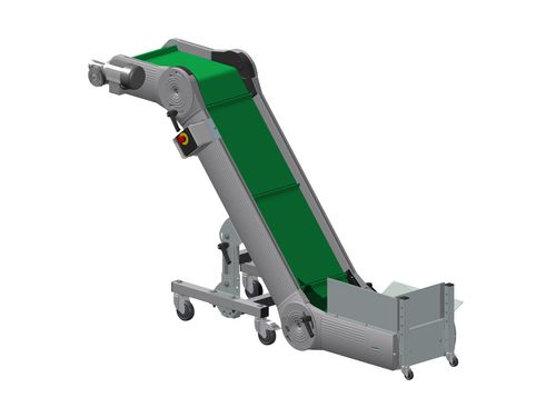Conveyor with a flat section for collecting and inclined section for elevating parts adjustable inclination.